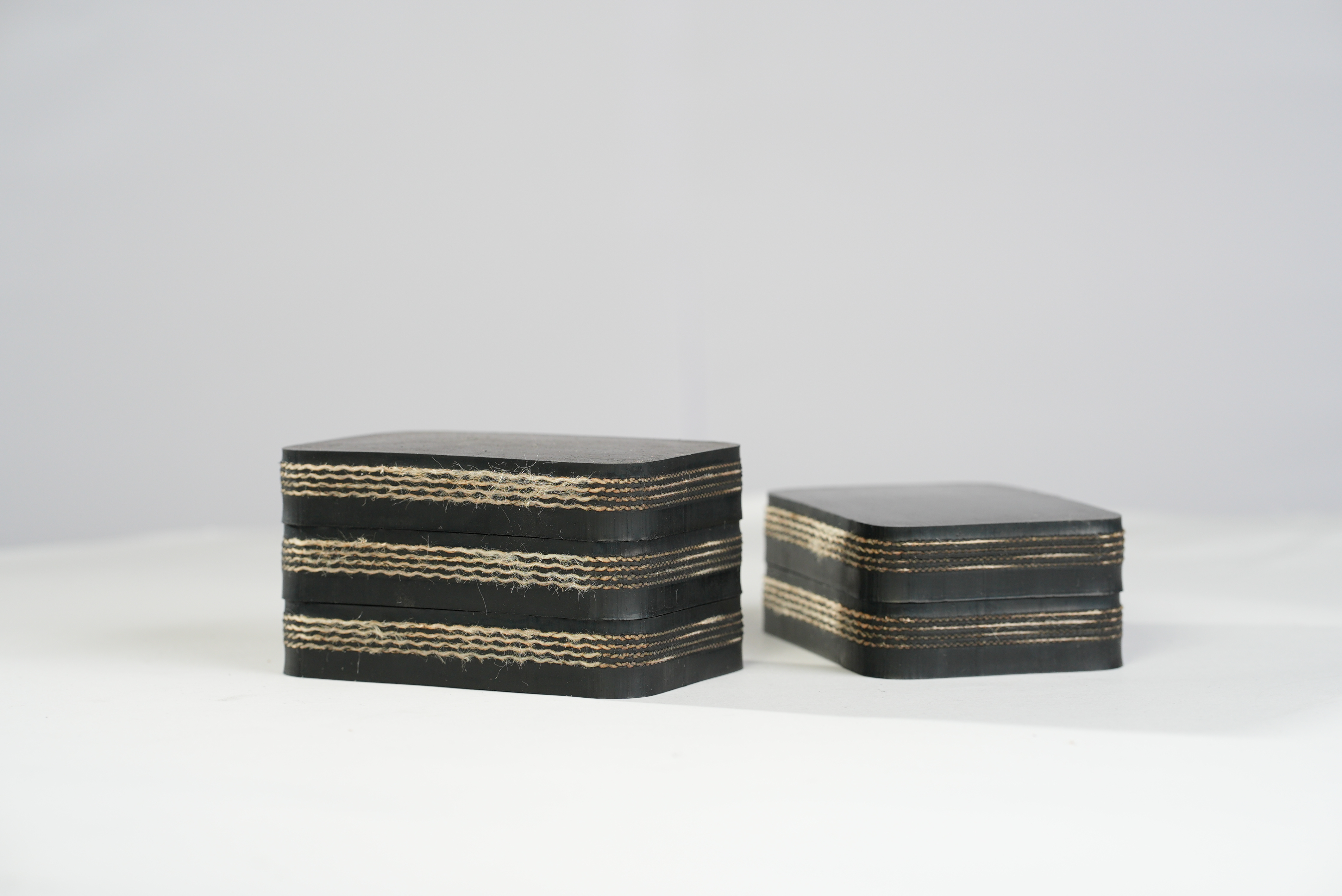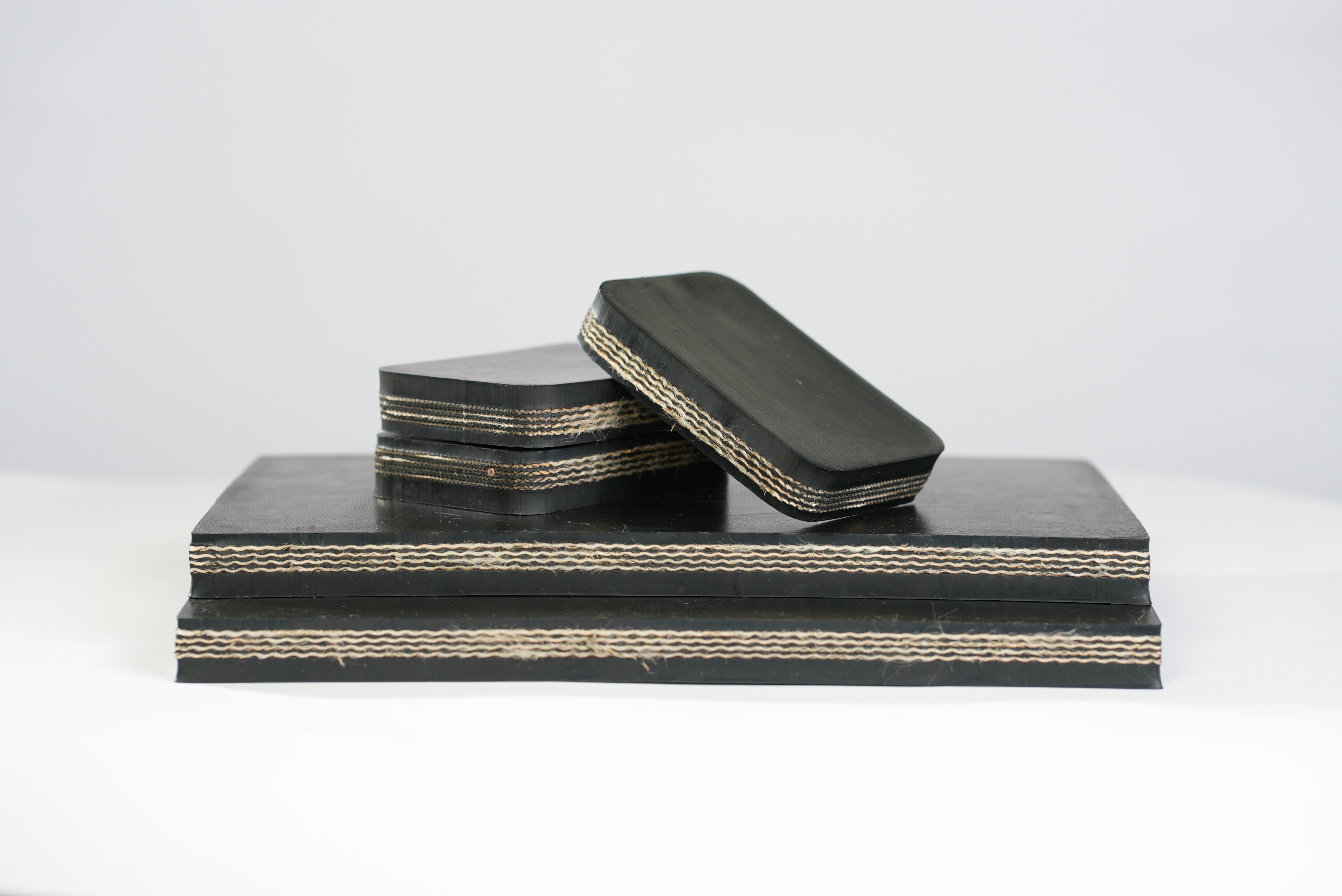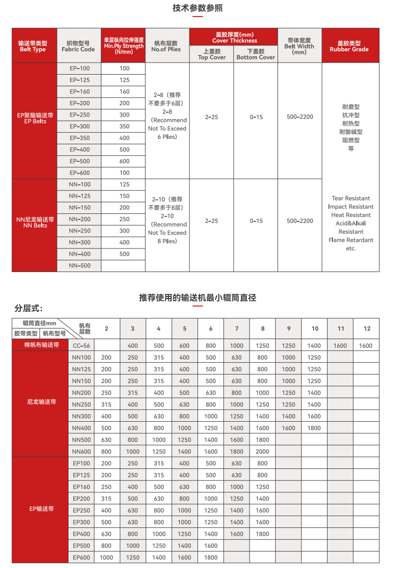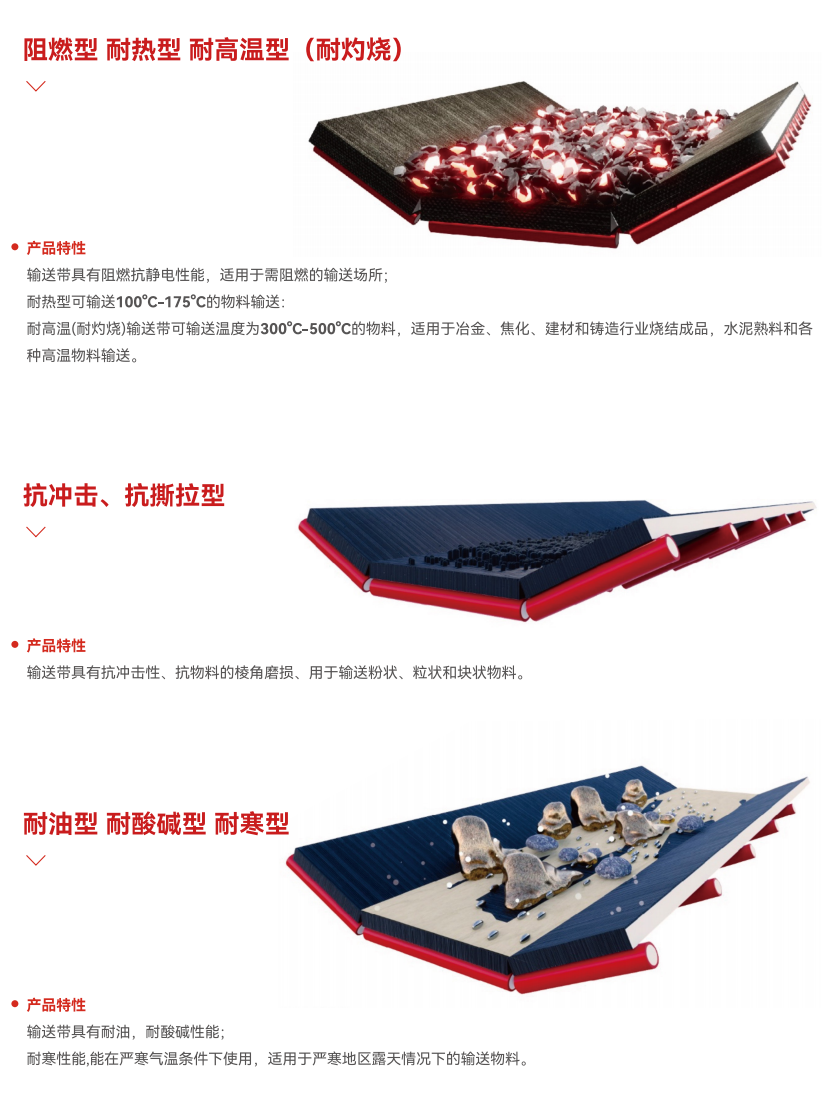 分层输送带较小的伸长率,高模量、高成槽性能,盖胶类型和厚度可有多种选择,耐热、耐油、耐酸碱、高耐磨、抗划裂、难燃、耐寒等盖胶类型